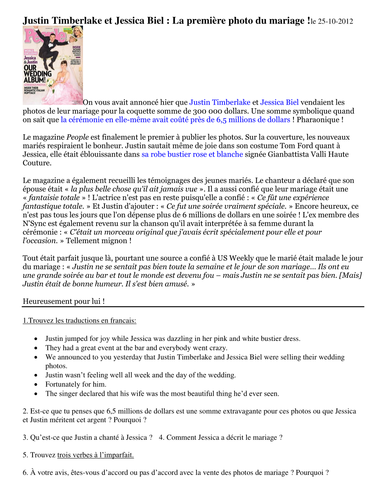 Le Mariage Comprehension Justin Et Jessica Teaching Resources